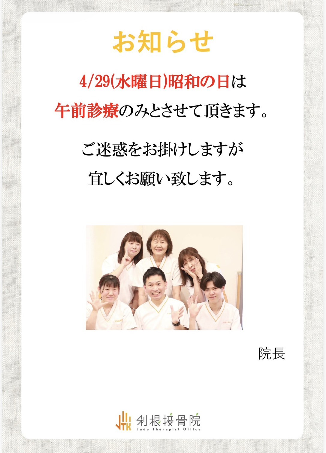 4月29日(水曜日)は通常通り午前診療のみ致します!